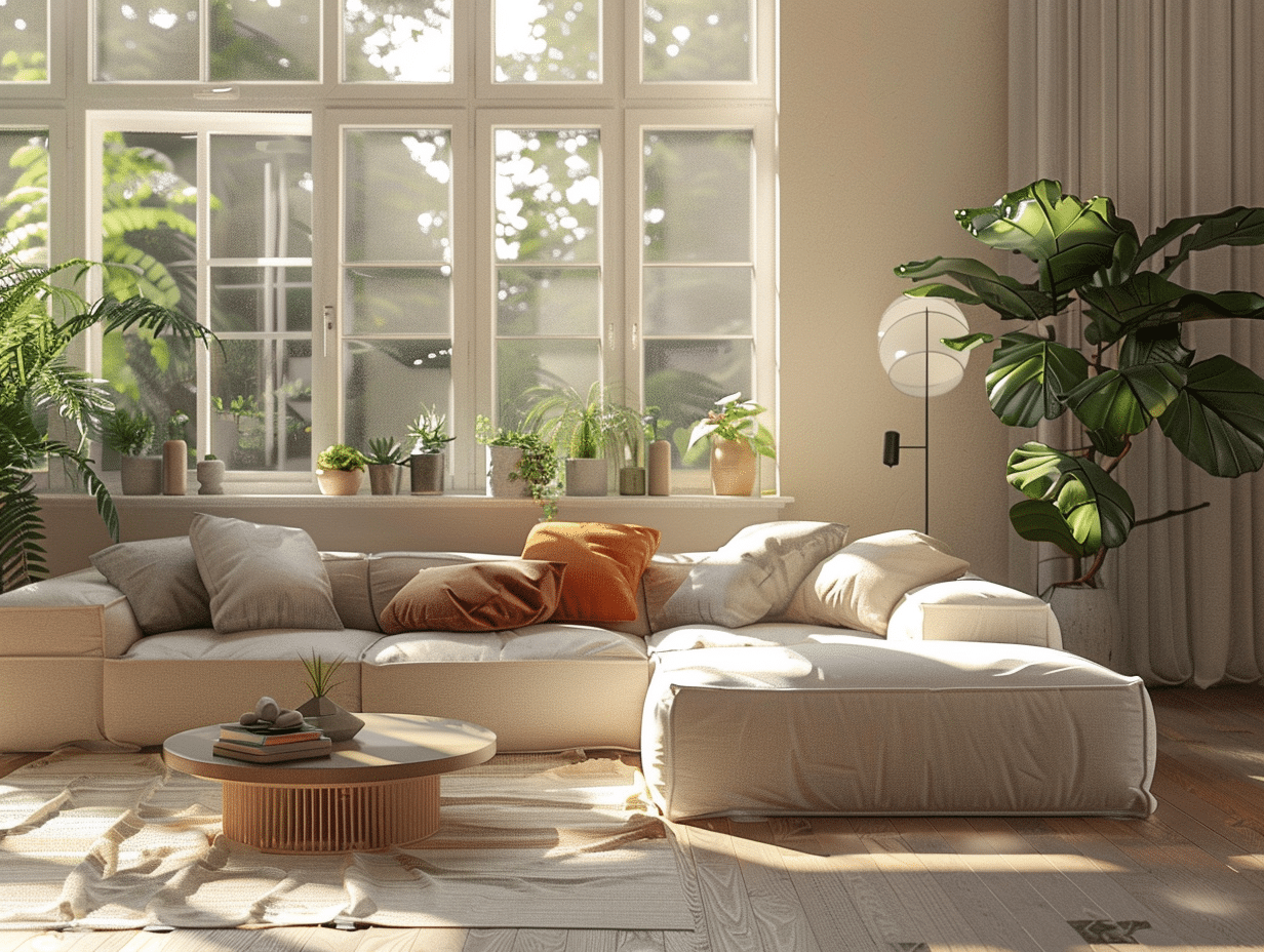 - Accessoires textiles : Coussins, plaids et rideaux dans des matières comme le lin ou le coton, déclinés en grège, enveloppent la pièce d’une douceur palpable. Multipliez les textures pour plus de profondeur.