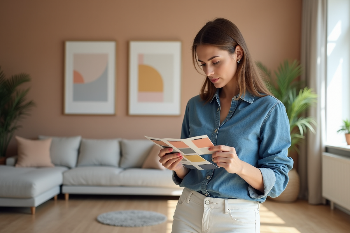 Femme choisissant des échantillons de peinture dans un salon moderne